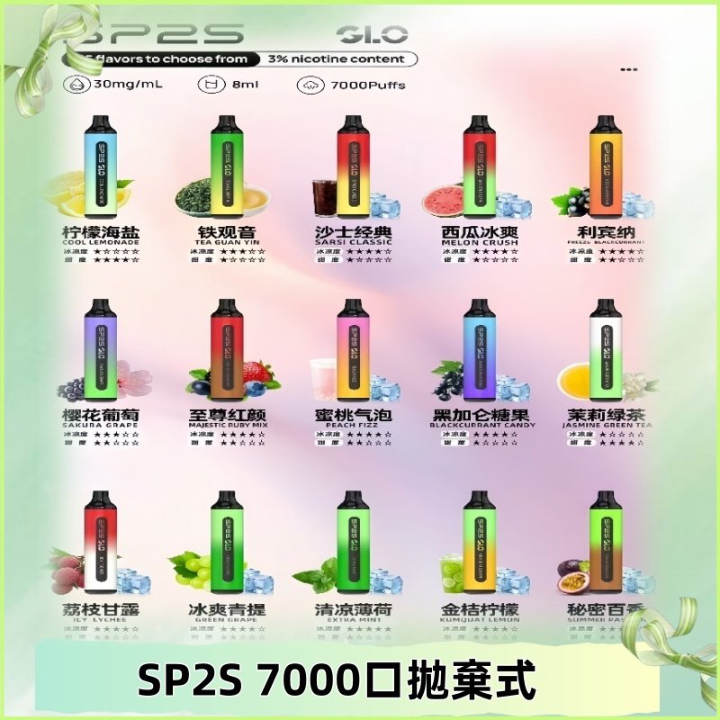 SP2S GLO 7000口一次性電子煙,配備8mL大容量煙油與600mAh電池,提供15種精緻口味,涵蓋水果、清涼、茶飲等,滿足多元需求。採用雙芯霧化技術,煙霧細膩,擊喉感純正,支援Type-C快充。